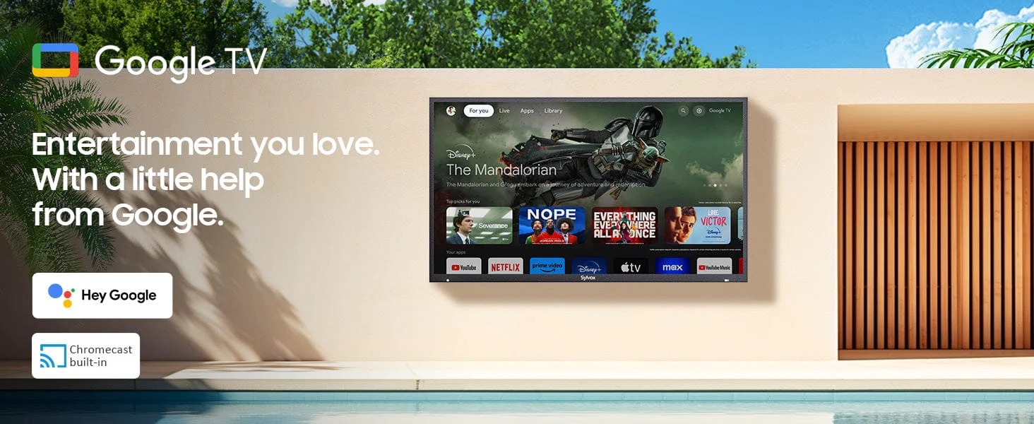 Styr din TV enkelt med röstkommandon. Med Google Assistant kan du byta kanal, starta appar eller söka efter innehåll – för maximal komfort utomhus.