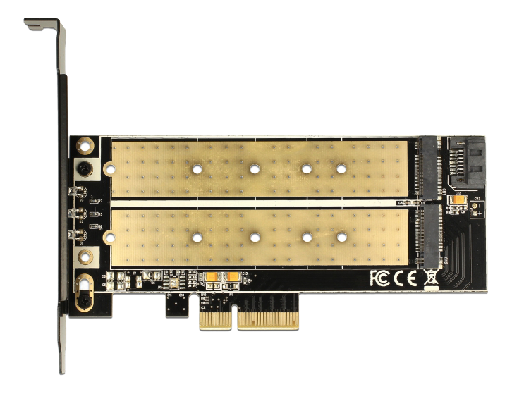 Detta PCI Express-kort från Delock utökar datorn med två M.2-kortplatser. Det kan anslutas en M.2 SATA-modul i formatet 22110, 2280, 2260, 2242, 2230 på detta kort och anslutas via SATA-kabel till moderkortet. Det kan även ansluta en M.2 PCIe-modul i formatet 22110, 2280, 2260, 2242, 2230. Bägge kortplatserna kan användas samtidigt.