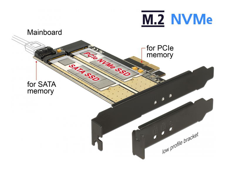 DeLOCK PCI Express x4-kort > 1 x internal M.2 Key B + 1 x intern NVMe M.2 Key M, Low Profile